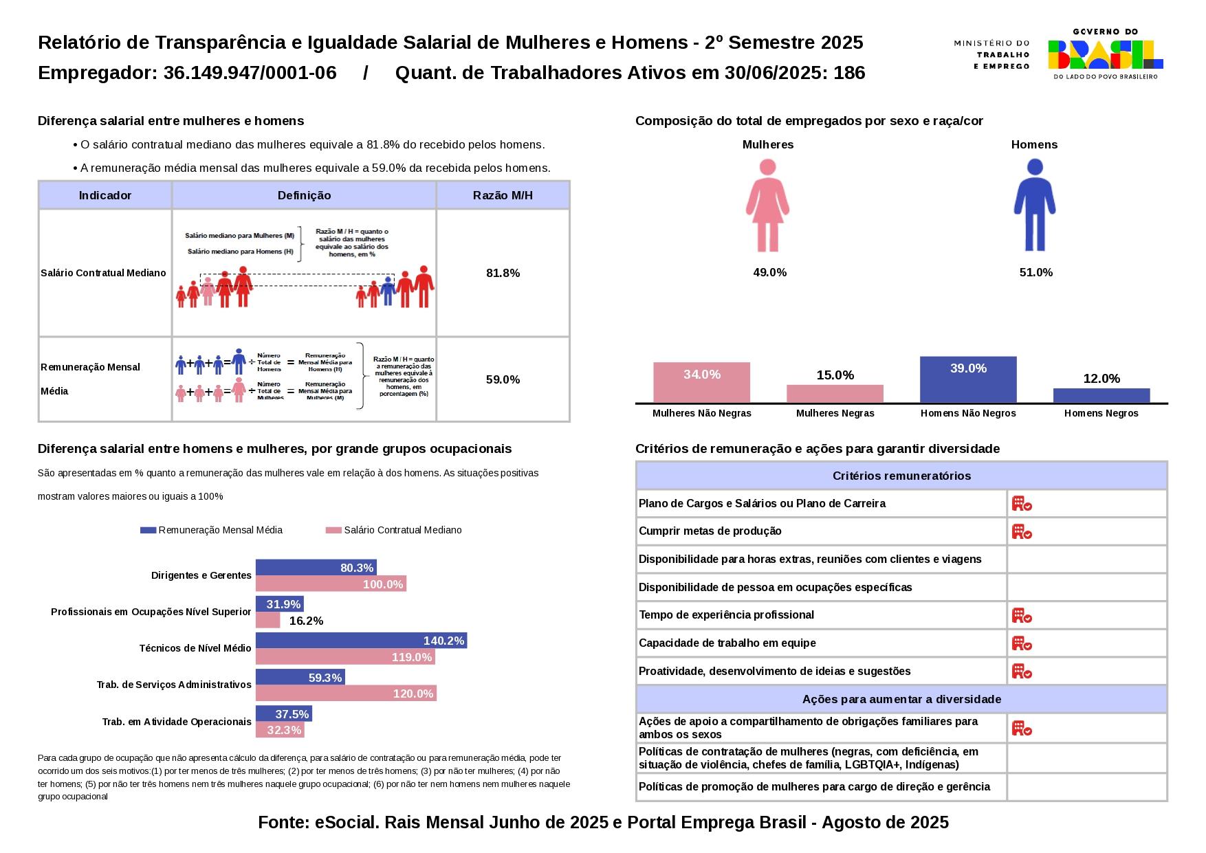 A divulgação do presente Relatório está em conformidade com as determinações da Lei 14.611/2023, sancionada e regulamentada pelo Decreto Federal nº 1.795/2023 e pela Portaria 3.714/2023, do Ministério do Trabalho e Emprego (MTE), que possuem o objetivo de promover a igualdade salarial entre homens e mulheres. Este relatório foi desenvolvido pelo MTE com base nos seguintes dados disponíveis em 2024, extraídos do Sistema Simplificado de Escrituração Digital das Obrigações Previdenciárias, Trabalhistas e Fiscais (e-Social):